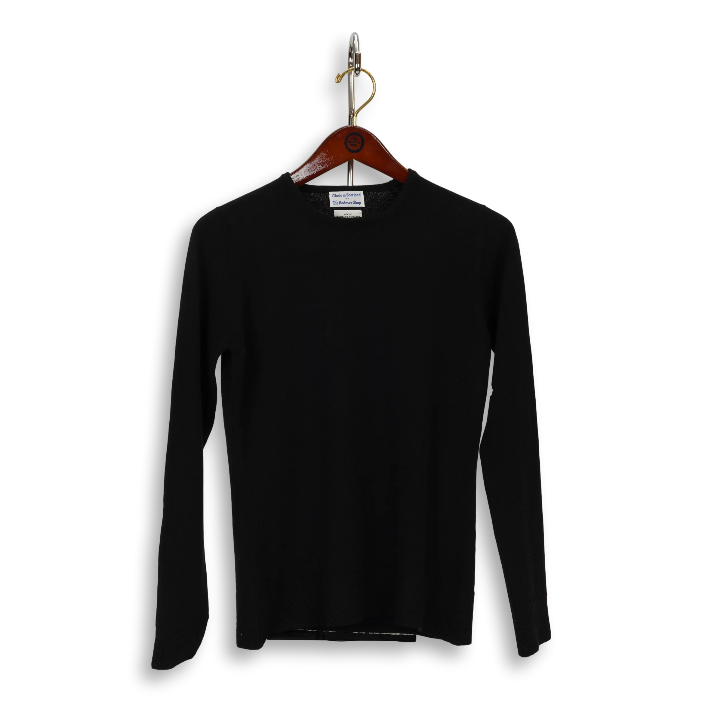 100% Pure Cashmere. Made in Scotland for The Andover Shop. This sweater features a small basket weave pattern knit along the waistband and cuffs.